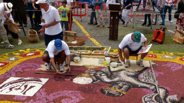 Die Stadt ist prächtig geschmückt und lädt die Besucher ein, die Blüten- und Sandteppiche bis zur Messe am späten Nachmittag und der sich anschließenden Prozession zu bewundern.