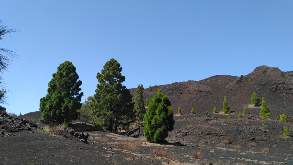 Junge Vulkane auf Teneriffa zeigen sich bei dieser Toure als dunkle schwarze und rot schimmernde Lavaberge. Diese beeindruckenden Formationen stehen bilden einen faszinierenden Kontrast zu den grün leuchtenden Kiefern und dem intensiven Blau des Himmels.